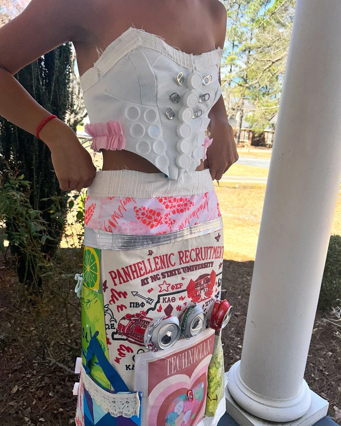 Discarded items from various school campuses transformed into a bold two-piece corset and skirt set. By collaging colorful textures and repurposed materials, I was able to create a piece that would have otherwise ended up in a landfill. This design was proudly submitted to North Carolina’s Recycled Trasion Show, highlighting my creativity and conscious design.