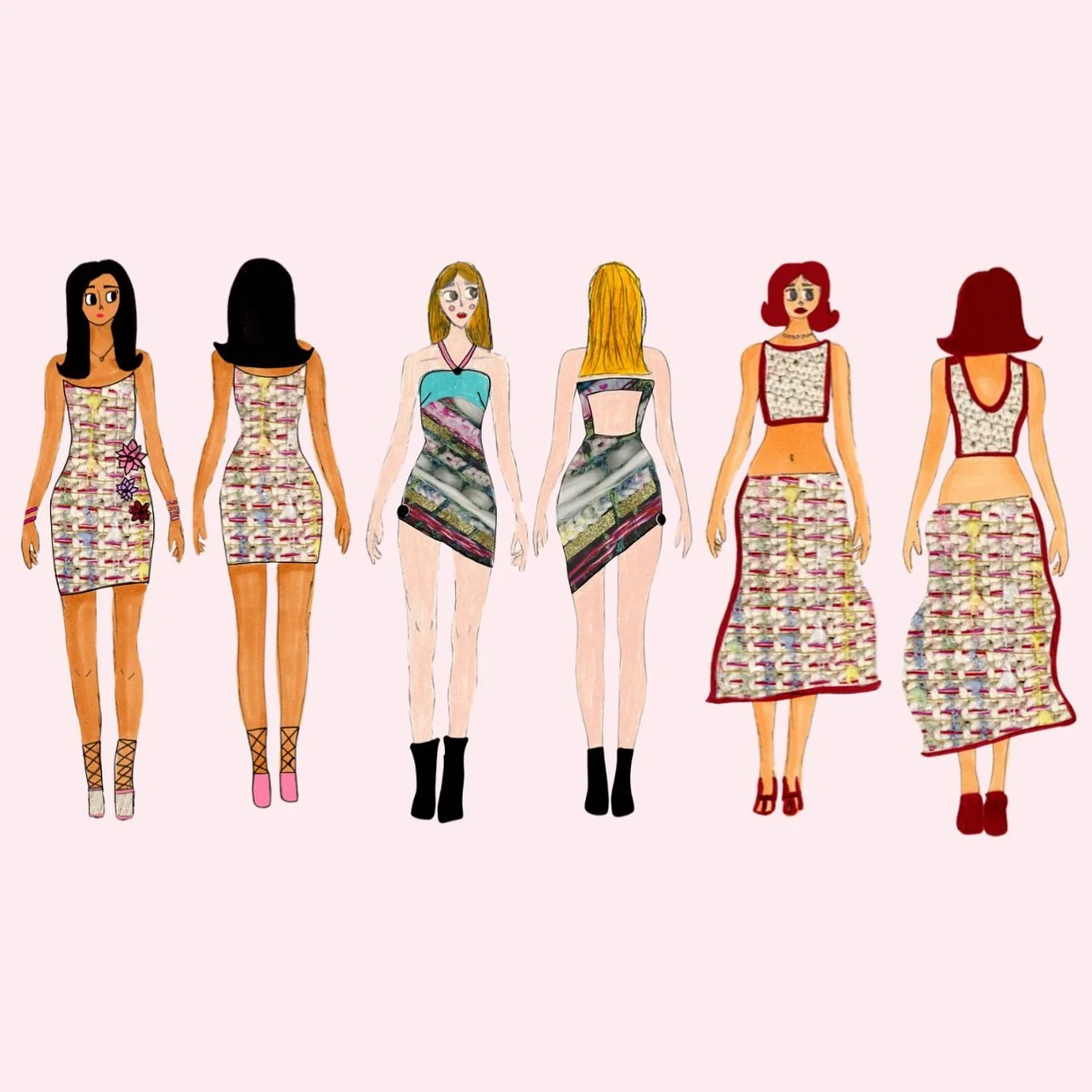 Using crochet bases and triangular frames as looms, I created vibrant, layered weavings. These pieces were then incorporated into fashion sketches and texture mapped in Adobe Photoshop. The collection reflects natural floral inspiration and gold accents woven throughout.