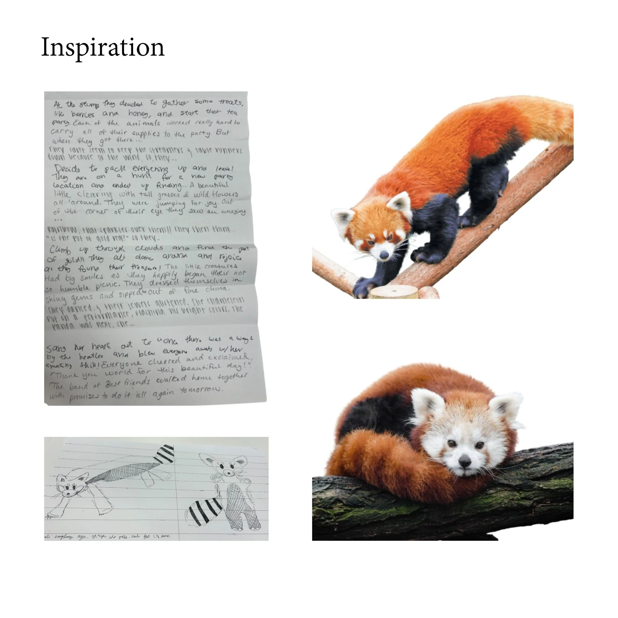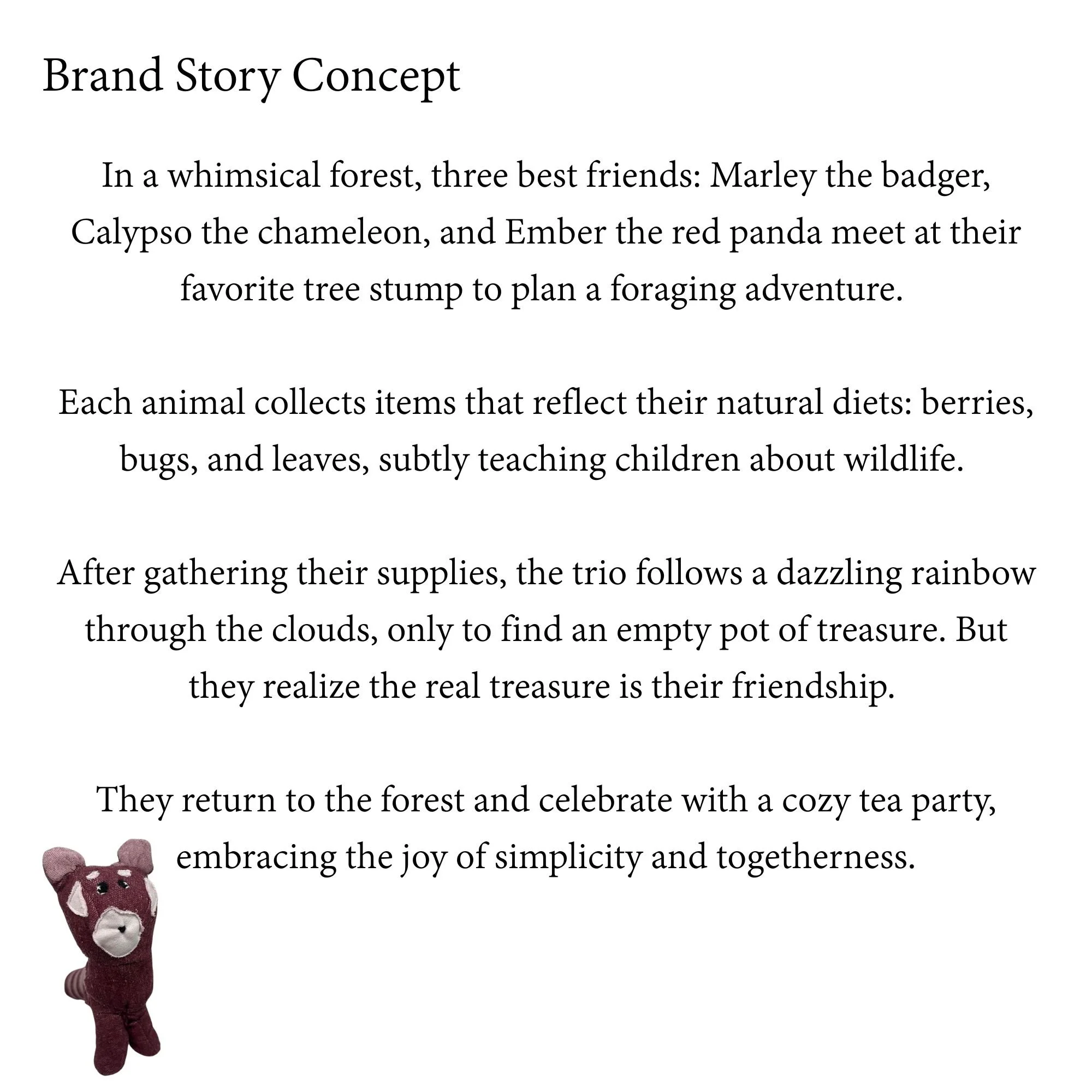 Tea Time is a brand centered around making children feel creative and imaginative. For this collection, I designed a red panda stuffed animal by researching its real-life traits for inspiration. I sculpted the shape with newspaper and tape, then made pattern pieces based on that form. After testing with prototype fabric, I adjusted the fit and details like the tail and eyes. Finally, I sewed the final version using raspberry-toned fabric to reflect the red panda’s natural look.