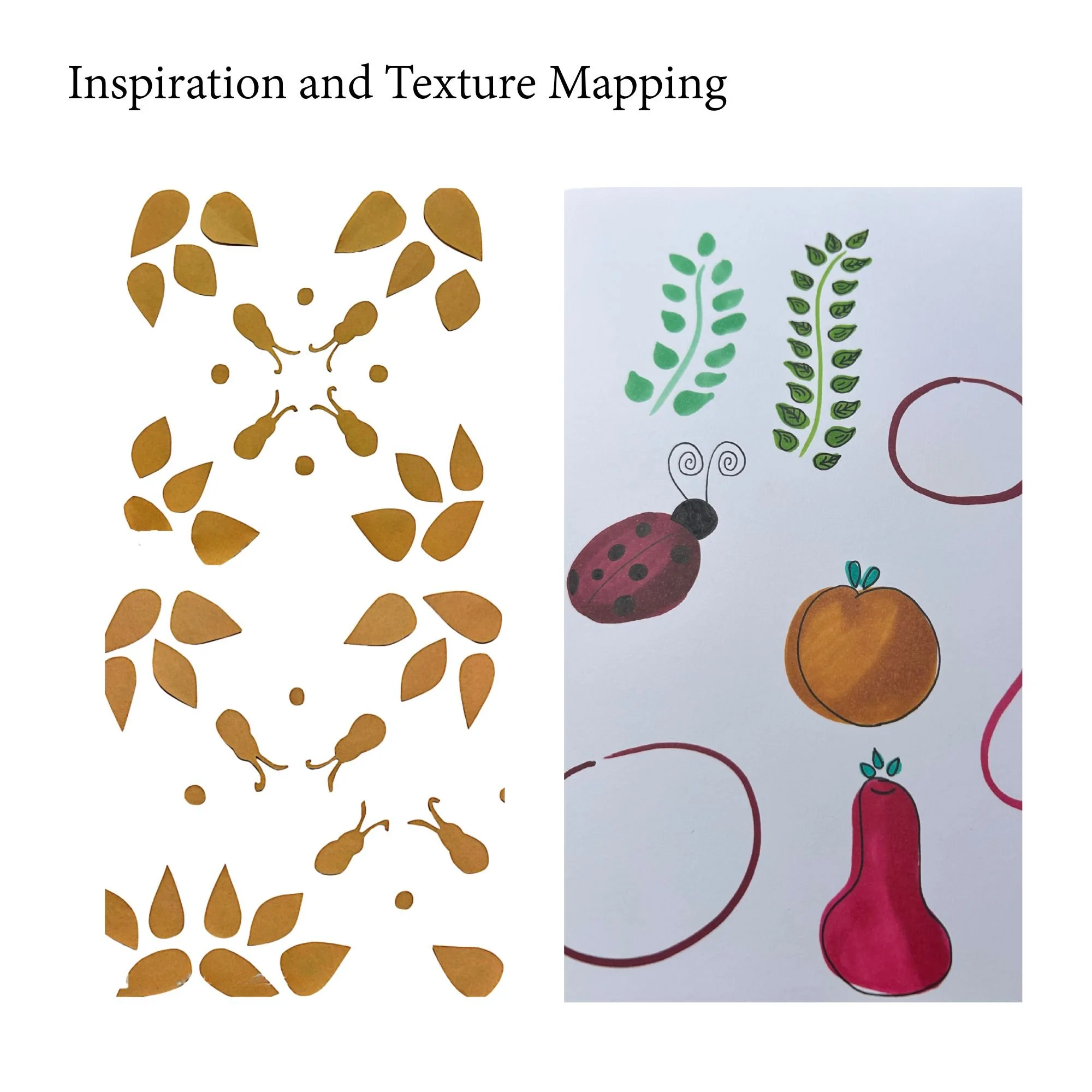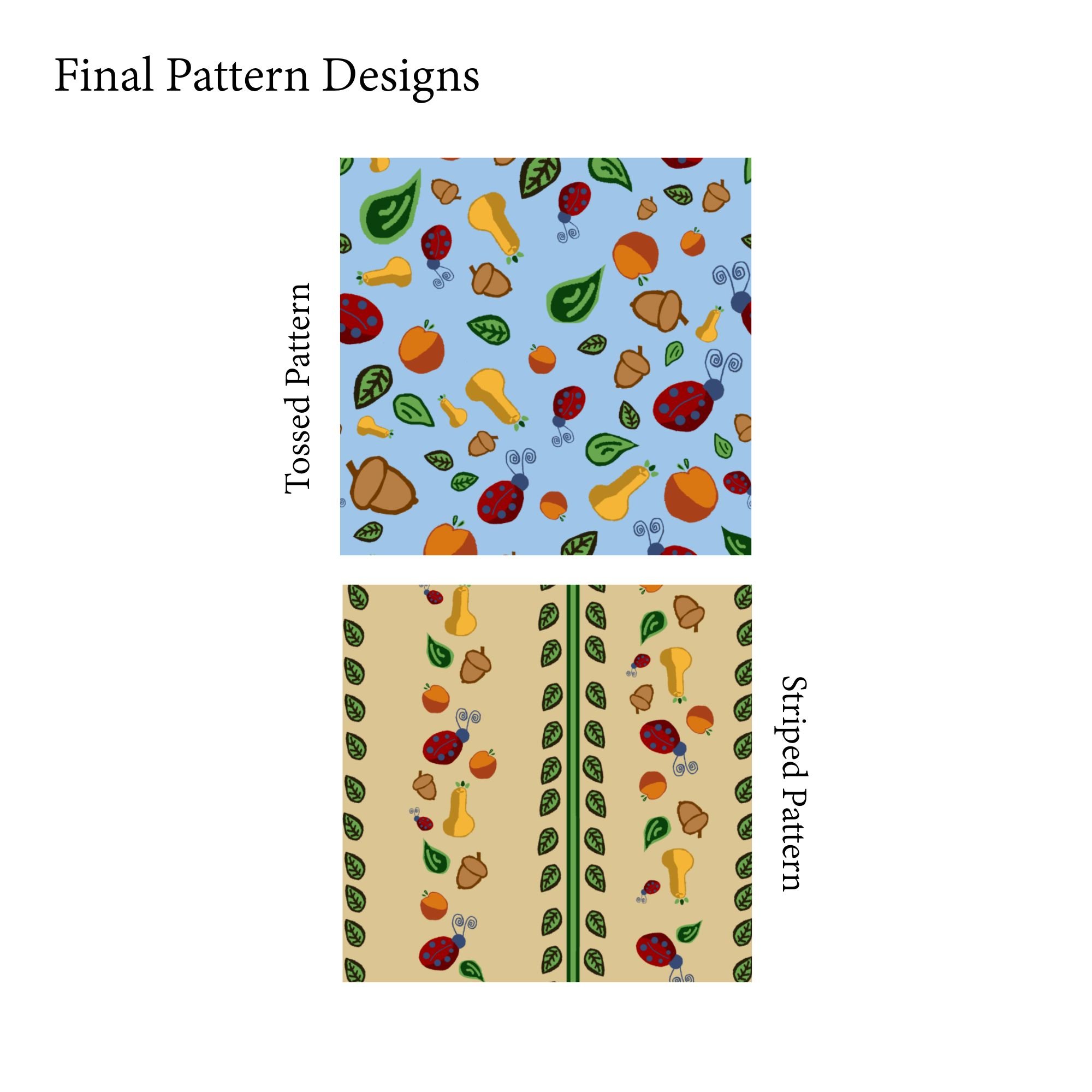 Wonder-fall Business is a Textile Collection developed through Ned Graphics and Adobe Photoshop to create a cohesive design. I started by sketching motifs, such as ladybugs, oranges/apples, gourds, and leaves, using watercolors in my sketchbook. These were scanned, refined, and cleaned digitally to create elements for pattern mapping. I experimented with paper pattern mirroring, then finalized two digital repeat designs based on user lifestyle research. I matched my colors to a palette and applied the patterns to mapped pocket squares and socks.