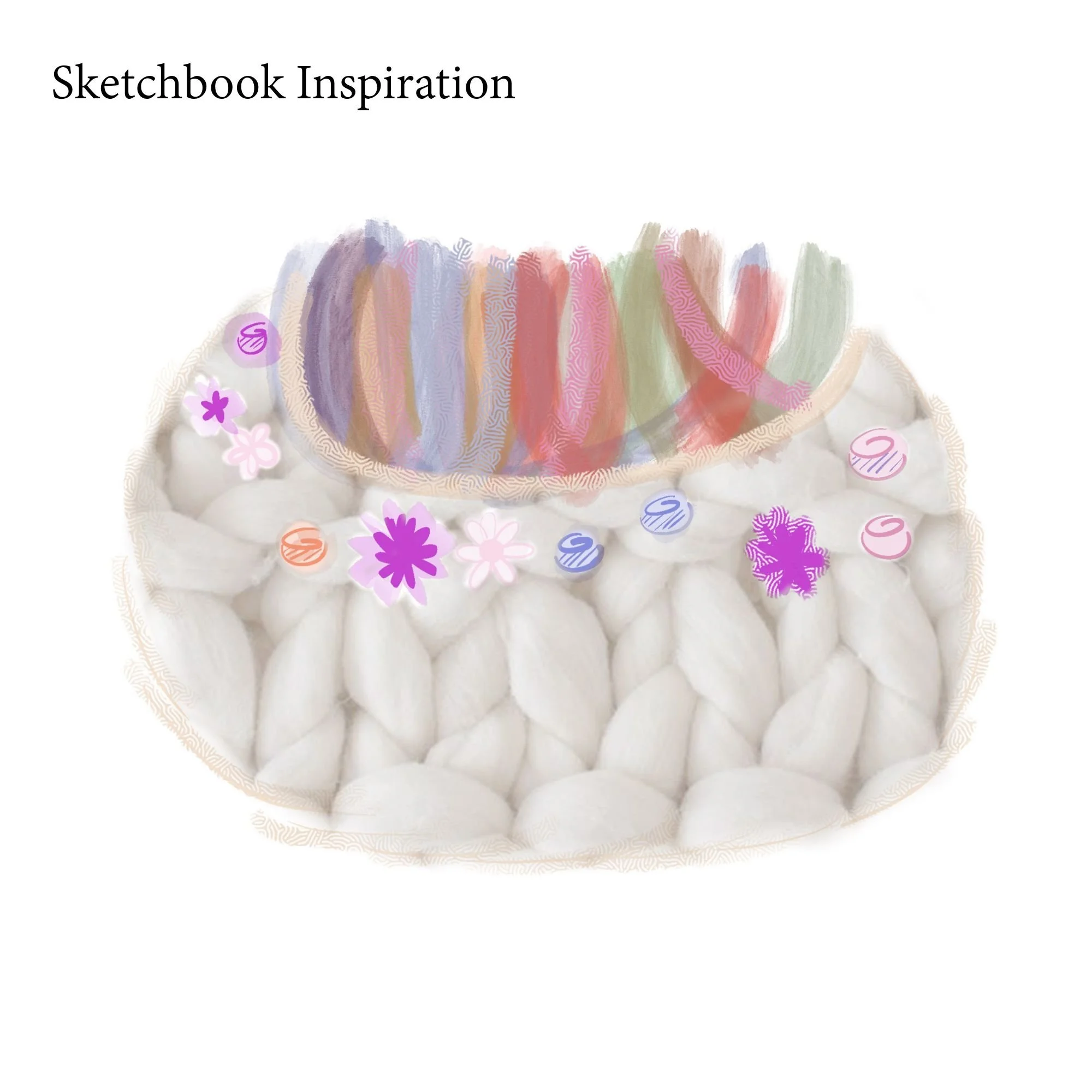 For the base, I crocheted a long strip using chunky cotton and wool yarn, then stitched it into an oval form to create a cohesive foundation. The layers and handmade felt roses were arranged and secured to build a textured surface, a fun experimentation of creating a color pallet and seeing it come to life through different surface textiles and embellishments.